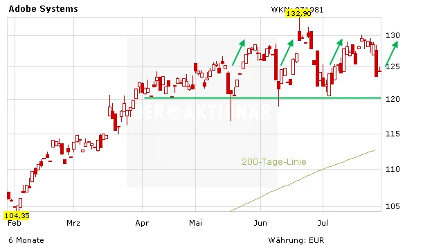 Seit Anfang Mai steckt die Adobe-Aktie in einem Seitwärtstrend fest. Der Verlust in der vergangenen Woche von rund vier Prozent bietet aktuell die Chance kurzfristig Kursgewinne abzustauben, sollte sich der Kurs innerhalb der Range ein viertes Mal in Richtung 130,00 Euro entwickeln.