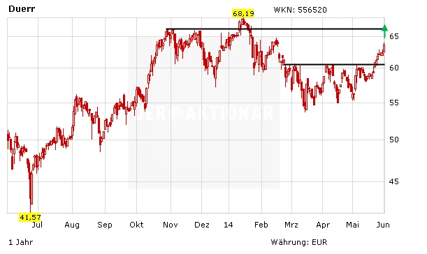 DER AKTIONÄR hat bereits erklärt: Dürr befindet sich auf Kurs. Zu diesem Schluss kommen auch immer mehr Analysten. So hat die Privatbank Berenberg hat das Kursziel für Dürr von 69 auf 71 Euro angehoben und die Einstufung auf "Buy" belassen. Der Konzern habe mit seiner Gewinnmarge die Erwartungen am Markt übertroffen, so Analyst Benjamin Gläser. Da er nun das Jahr 2016 in seine Schätzungen einbeziehe, hebe er auch das Kursziel an. Insgesamt sehe er die Aktie als attraktiv bewertet an. Der Abschlag zum Sektor, mit dem das Papier gehandelt werde, sei nicht gerechtfertigt.