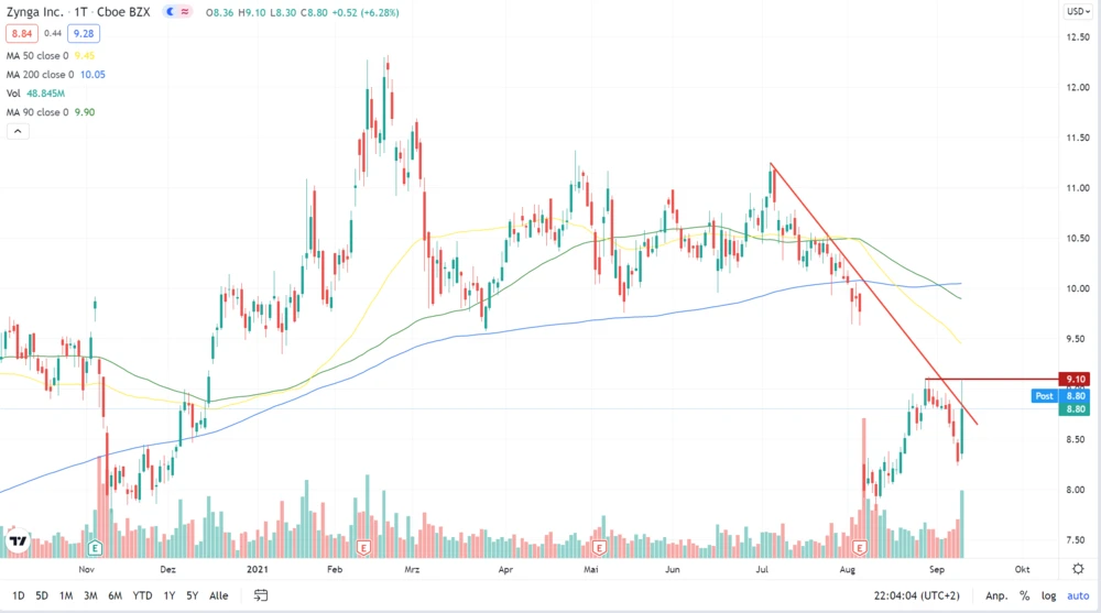 An der Börse schoss die Zynga-Aktie am Freitagabend zeitweise um fast zehn Prozent auf 9,10 Dollar nach oben. Auf diesen Niveau verläuft ein horizontaler Widerstand sowie die übergeordnete Abwärtstrendlinie. Allerdings konnten die Papiere diese Hürden nicht überwinden und gaben zuletzt einen Teil der Kursgewinne wieder ab. Der Abwärtstrend bleibt damit vorerst weiter intakt.