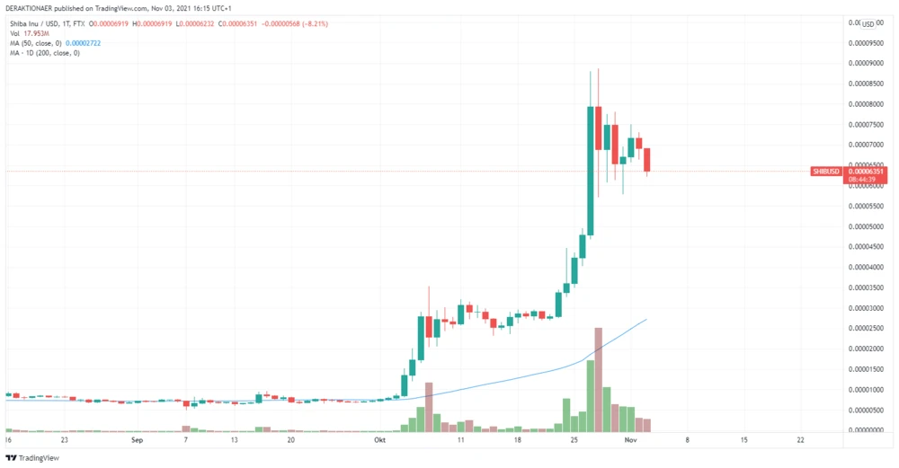 Ende Oktober erreichte SHIB noch ein neues Allzeithoch bei 0,0000887 Dollar pro Coin. Im Anschluss setzten Gewinnmitnahmen ein und der Kurs sackte bisher rund 30 Prozent ab. Die Abwärtsdynamik nimmt heute weiter zu und es droht ein massiver Absturz. Ein Muster, das bei allen Meme-Coins zu beobachten war: Nach einer massiven Kursexplosion fielen die Kurse genauso schnell wieder, wie sie gestiegen sind.