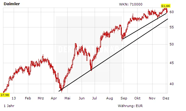 Es bleibt dabei: Mit einem 2014er KGV von 11 ist die Aktie von Daimler noch immer moderat bewertet. Die neue Modelloffensive dürfte dem Kurs in Zukunft weiter Rückenwind verleihen. Spielt der Gesamtmarkt mit, könnte die Aktie in den nächsten Wochen nach Ansicht des AKTIONÄRs zunächst die Marke von 65 Euro in Angriff nehmen.