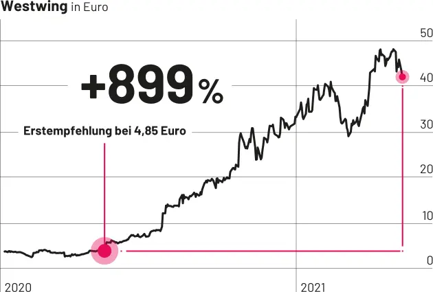 Zusätzlich ist Florian Söllner bestens in Bereichen wie Wasserstoff, Mobile, Robotik, KI, VR oder Mobility vernetzt und nutzt seine Kontakte, um aus allererster Hand Informationen von Vorständen, Großinvestoren und Experten zu erhalten. Durch dieses entscheidende Hintergrundwissen wird ein Mix aus gewinnträchtigen Small Caps und Hidden Champions möglich. So wurde auch im Fall von Westwing durch Interviews mit dem Vorstand klar: Der Kauf von stylishen Produkten für die Hausverschönerung ist ein großer Boom im Lockdown-Jahr. Leser des Hot Stock Report konnten somit früher als viele andere vom anschließenden Boom der Aktie profitieren und so seit Mai 2020 innerhalb eines Jahres eine unfassbare Rendite von plus 899 Prozent einfahren.