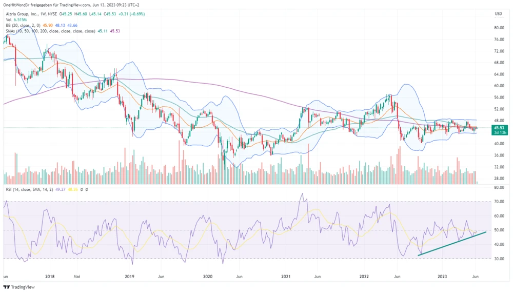 Das allerdings könnte sich zumindest kurz- und mittelfristig ändern, denn wenngleich der Langfristchart noch immer wenig Mut macht, ist die seit etwa einem Jahr anhaltende Seitwärtskonsolidierung durchaus vielversprechend. Vor allem in den vergangenen Wochen hat sich das Chartbild etwas aufhellen können. Nur wenig mehr als ein Prozent fehlen Altria aktuell, um mit der 50- und 200-Tage-Linie zwei vielbeachtete Durchschnitte hinter sich zu lassen und ein erstes Kaufsignal zu generieren.