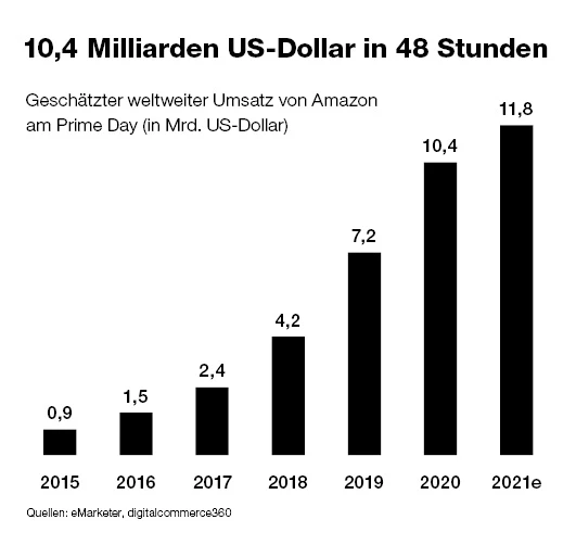 Für Amazon ist der Prime Day zum Riesengeschäft geworden. Nahm Amazon zum Start 2015 gerade einmal 900 Millionen Dollar am Prime Day ein, waren es 2020 10,4 Milliarden Dollar und damit ein Plus von 45 Prozent im Vergleich mit 2019.