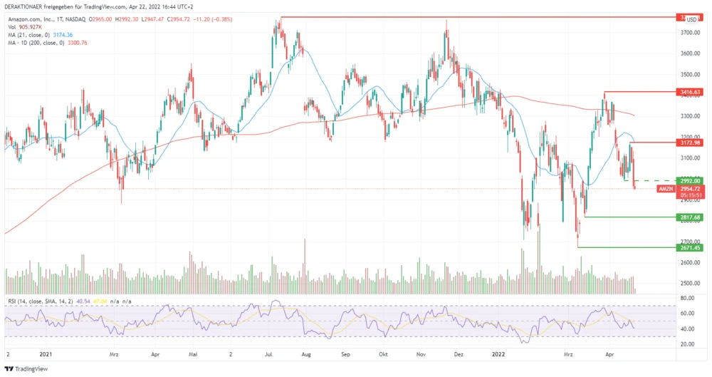 Aus technischer Sicht befindet sich die Amazon-Aktie seit fast zwei Jahren in einem Seitwärtstrend. Die Extremwerte dieser Range umfassen auf der Unterseite die 2.670-Dollar-Marke und auf der Oberseite die 3.770-Dollar-Marke. Seit Jahresbeginn steht der Titel aufgrund der Zinswende zunehmend unter Druck. Insbesondere in den vergangenen Tagen sackte der Kurs deutlich unter den GD200 bei 3.300 Dollar ab. Am vergangenen Donnerstag rutschte die Aktie zudem unter die psychologisch wichtige 3.000-Dollar-Marke und löste damit ein Verkaufssignal aus. Als nächster Support steht die das 2.800-Dollar-Level bereit.