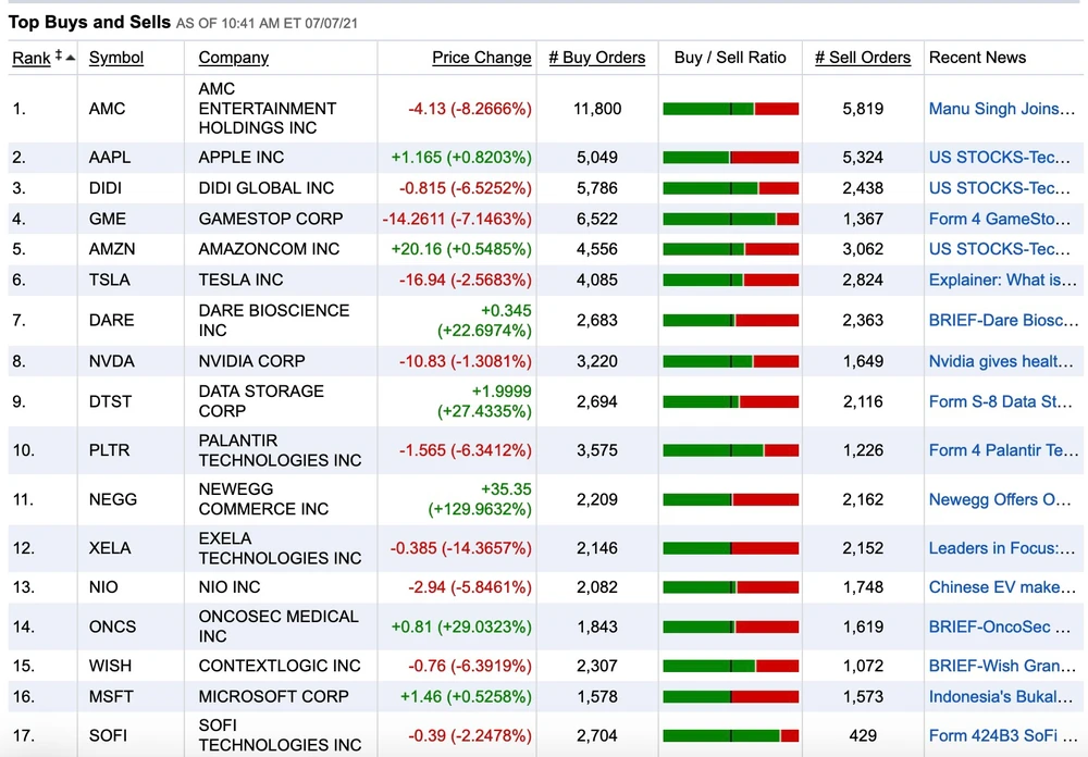 Eine Auswertung des Brokers Fidelity vom Mittwoch unterstreicht die Standhaftigkeit der AMC-Investoren. Auf der Handelsplattform wurde die Aktie der Kinokette fleißig gehandelt und war am Ende des Handelstages der umsatzstärkste Titel. 11.800 Kauf-Orders im Vergleich zu 5.819 Verkauf-Orders deuten darauf hin, dass der Kampf zwischen Reddit-Trader und Shortseller weiter anhalten wird.
