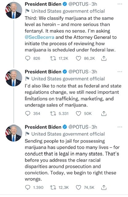 Klare Ansage von Joe Biden: „Es macht keinen Sinn: Wir behandeln Marihuana auf dem gleichen Level wie Heroin.“ Keiner solle wegen Grasbesitz ins Gefängnis.