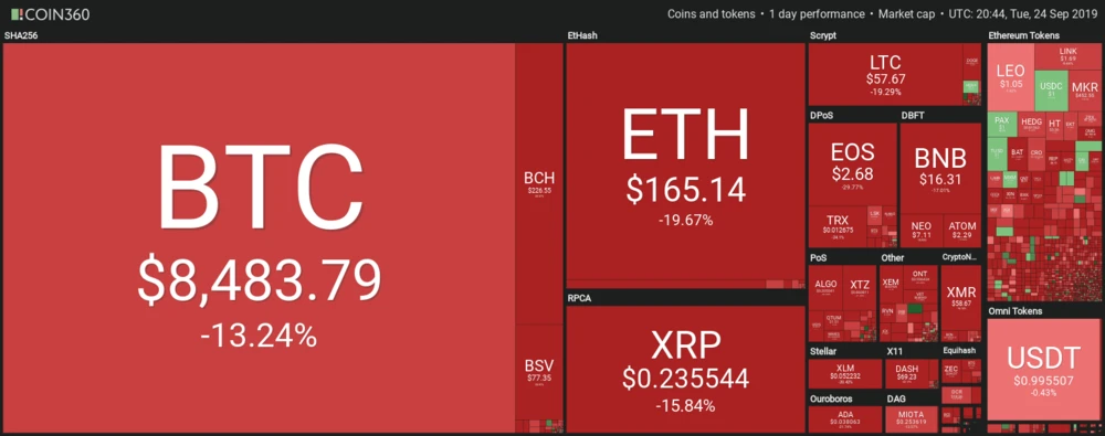 Neben dem Bitcoin geht es allerdings auch für die meisten Altcoins steil bergab. Unter den Top-Coins nach Marktkapitalisierung erwischt es EOS und Bitcoin SV mit Verlusten von rund 30 Prozent besonders hart. Lediglich einige Stable Coins wie Tether oder USD Coin profitieren und legen moderat zu.