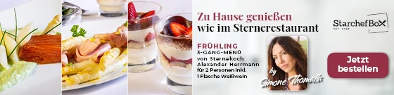 Gemeinsam haben der Sternekoch Alexander Herrmann und die Schauspielerin und Sängerin Simone Thomalla das neue Gourmetmenü der StarchefBox kreiert. Herausgekommen ist ein frühlingshaftes und lecker-leichtes 3-Gang-Menü. „Frühling by Simone Thomalla“ überzeugt mit Spargelsalat, gebeizter Lachsforelle und Frankfurter Grüner Sauce als Vorspeise, Spargel mit Landschinken und Bärlauchgnocchi in Zitronen-Nussbutter-Sauce sowie einem fruchtigen Erdbeer-Tiramisu als Dessert. Inklusive einer Flasche fränkischem Weißwein ist die Celebrity-Dinnerbox für 125 Euro erhältlich.