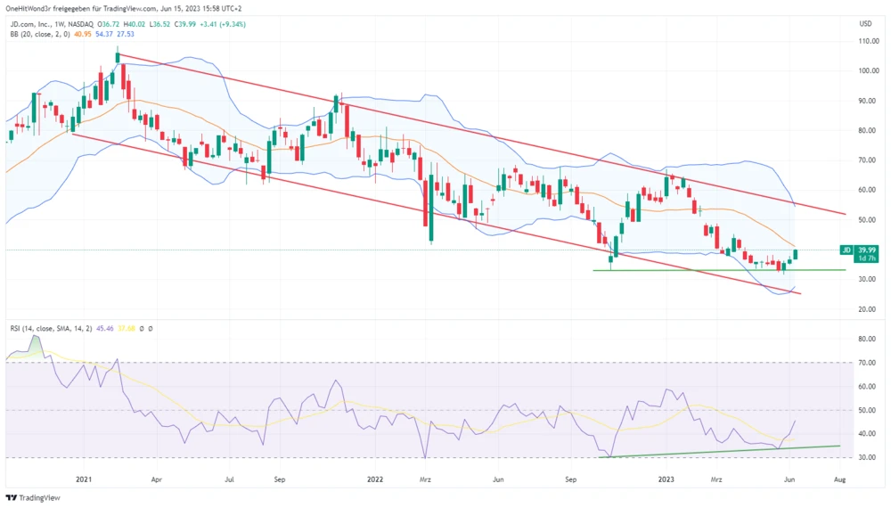 Wenn es vor dem Hintergrund solchen Rückenwindes nicht mit einer Trendwende klappt, wann dann? Tatsächlich verfügt JD.com aktuell die Chance auf einen Doppelboden bei 33 Dollar. Wie schon im Herbst letzten Jahres führte diese Kursmarke in den vergangenen Tagen zu einer beachtlichen Erholung. Als vielversprechend darf diese gelten, da der Aktie im Relative-Stärke-Index eine bullische Divergenz gelungen ist: Trotz eines frischen 52-Wochen-Tiefs Ende Mai konnte sich der RSI gegenüber dem Tief im vergangenen Herbst leicht verbessern. Solche Divergenzen gehen häufig mit steigenden Kursen einher.