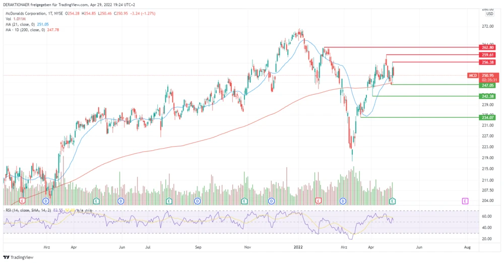 Die Schweizer Bank Credit Suisse hat McDonald's nach Zahlen auf "Outperform" mit einem Kursziel von 285 US-Dollar belassen. Die Fast-Food-Kette habe mit einem starken ersten Quartal die Erwartungen übertroffen, schrieb Analystin Lauren Silberman in einer am Freitag vorliegenden Studie. Ihre moderat gesenkten Ergebnisschätzungen (EPS) für 2022 und 2023 begründete sie mit der Schließung von rund 950 Filialen in Russland und der Ukraine.