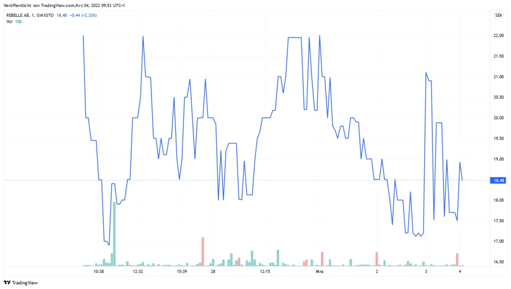 Im aktuell schwierigen Marktumfeld ging die Aktie am Freitag vergangener Woche bei 22 Schwedischen Kronen (SEK; 2,64 Euro) in den Handel, brach anschließend in der Spitze um fast 40 Prozent ein und schloss mit einem Tagesverlust von zehn Prozent. Auch in der laufenden Woche hält die Volatilität an: Freitagvormittag notieren die Rebelle-Papiere acht Prozent im Plus bei 18,92 SEK.
