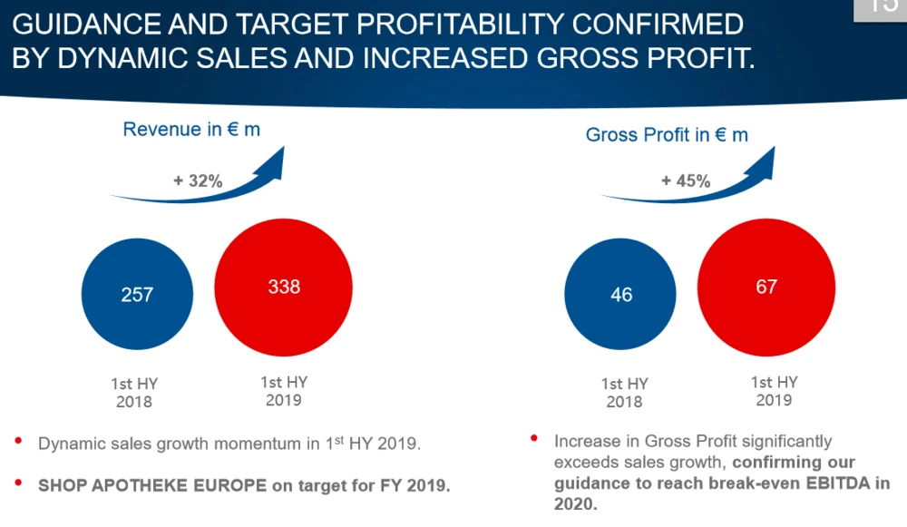 Außerhalb der DACH-Region konnte Shop Apotheke Europe die Erlöse sogar um 83 Prozent auf 40 Millionen Euro steigern. Die Anzahl der aktiven Kunden legte im ersten Halbjahr 2019 um 50 Prozent auf 4,2 Millionen zu. Dementsprechend zogen auch die Bestellungen an (um 44 Prozent auf 5,9 Millionen Stück).
