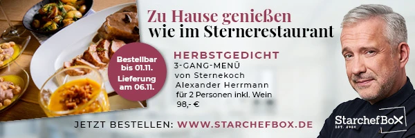 Das komplette 3-Gang-Menü wird fertig zubereitet per Express-Sendung direkt zu Ihnen nach Hause geliefert und muss dort lediglich mit ein paar einfachen Handgriffen finalisiert werden. Eine Bestellung der Herbst-Edition ist bis zum 1. November 2020 möglich. Das Menü wird in der Regel am Mittwoch frisch zubereitet, sodass Sie sich am nachfolgenden Freitag, den 06.11.2020, auf die Anlieferung bei Ihnen zu Hause freuen können. Einem Schlemmerwochenende steht dann nichts mehr im Wege. Der Preis für das 3-Gang-Menü vom Sternekoch beträgt 98 €, inklusive Spitzenwein und Versandkosten.