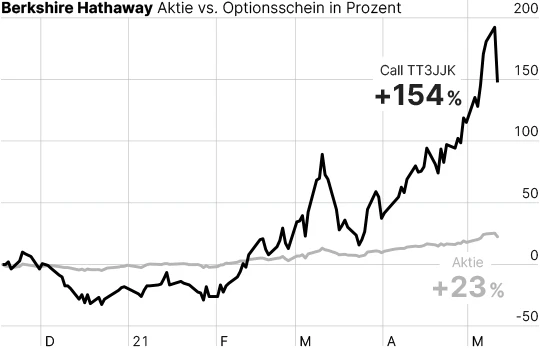 154 Prozent Plus innerhalb von nur wenigen Monaten, während der Aktienkurs von Berkshire Hathaway nur um 23 Prozent zulegen konnte. Wie ist das möglich? Durch den gezielten Einsatz von Optionsscheinen. Denn nur mit ihrer Hilfe ist es möglich, das Maximum an Gewinnen herauszukitzeln. Hier setzt der Börsendienst der 800%-Strategie PLUS an. Mit einer bewährten Erfolgsformel, die auf einer 3-Phasen-Strategie basiert, wird mit trendstarken Werten und durchgerollten Optionsscheinen der Performancehebel angesetzt.