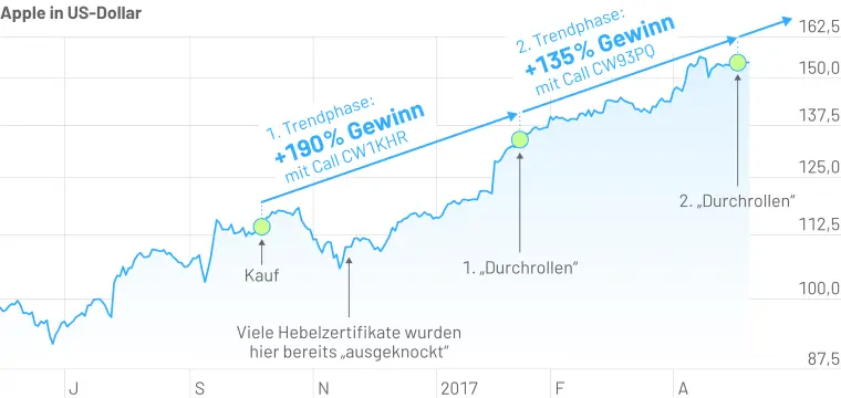 Hier sehen Sie einen kleinen Ausschnitt der Kursentwicklung der Apple-Aktie. Und die Performance zweier Trendphasen aus der 800-Prozent-Plus-Strategie. Durch cleveres Durchrollen steht bei Apple inzwischen ein Gewinn von 1.600 Prozent auf der Uhr. Aus einem Einsatz von 1.000 Euro sind innerhalb weniger Jahre 17.000 Euro geworden. Durchrollen? Das ist die besondere Komponente der 800-Prozent-Plus-Strategie: Einmal identifizierte starke Trendaktien werden nicht direkt gekauft, sondern ihre zu erwartende starke Performance mit einem optimal abgestimmten Hebel-Optionsschein maximiert. Dann – wenn der Schein irgendwann seine Kraft verliert – wird der Schein jedes mal aufs Neue getauscht, um die optimale Hebelwirkung konstant hoch zu halten.