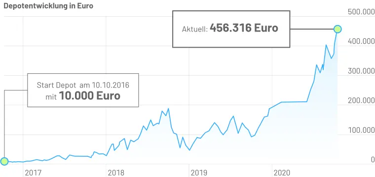 Im Vordergrund steht dabei nicht der kurzfristige Erfolg. Keine wilden Zocks, irren Trades. Im Vordergrund steht der langfristige Erfolg. Das Ziel lautet: Sieben Jahre nach dem Einstieg soll aus einem Anfangsbestand von 10.000 Euro eine Million Euro werden. Der Dienst startete 2016. Nach nun rund vier Jahren steht ein Gewinn von 4.463 Prozent zu Buche. Gelingt "nur" eine weitere Verdopplung, ist das Ziel erreicht.