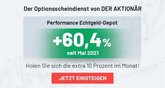 Seit nunmehr 6 Monaten stellen DER AKTIONÄR-Chefredakteur Leon Müller und Deutschlands größte Kapitalmarktredaktion ihre Qualitäten und ihr Gespür für den richtigen Hebel unter Beweis. Der Erfolg spricht für sich: In den letzten 6 Monaten hat das Team das Depot mit minimalem Aufwand zu maximalen Gewinnen geführt. Seit Startschuss Ende Mai 2021 verzeichnet der Optionsscheindienst – abzüglich Steuern und Gebühren – ein Plus von 60,4 Prozent! (Stand: 08.11.2021)