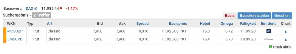Als nächstes geht es an die Auswahl des Put-Optionsscheins. Dazu geht man auf ein Finanzportal wie finanztreff.de und gibt in der Optionsscheinsuche folgende Parameter ein: