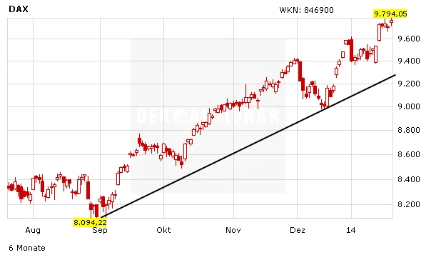 Der DAX ist am Dienstagnachmittag auf 9.794 Punkten gestiegen und hat somit ein neues Rekordhoch markiert. Für Unterstützung sorgt der jüngste Konjunkturausblick des Internationalen Währungsfonds (IWF). Die Weltwirtschaft wird nach Meinung des IWF wieder Fahrt aufnehmen.