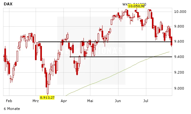Der DAX hat am Nachmittag seine Verluste ausgeweitet und mittlerweile die wichtige 9.600-Punkte-Marke recht deutlich unterschritten. Neben den geopolitischen Risiken gibt es ein neues Störfeuer aus den USA. Dort ist die Zahl der noch nicht vollständig abgeschlossenen Hausverkäufe im Juni überraschend gesunken. Der DAX droht nach unten abzudriften.