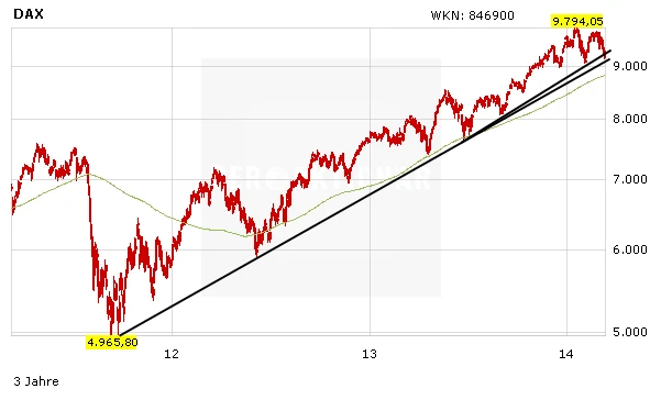 Ein Blick auf den DAX-Chart verrät, dass der Index exakt auf dem obergeordneten Primärtrend aufgesetzt hat. Dieser verläuft bei 9.145 Punkten. Der seit Juni 2013 bestehende sekundäre Aufwärtstrend wurde bereits am Montag gebrochen.