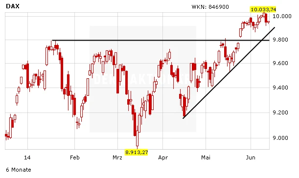 Nach der jüngsten Rekordjagd hat der DAX eine Pause eingelegt. Am Donnerstag notiert der deutsche Leitindex in einem ruhigen Handel bei rund 9.960 Punkten. Die 10.000-Euro-Marke bleibt damit in Reichweite. Die jüngste Aufwärtsdynamik scheine etwas Kraft verloren zu haben, sagte Markus Huber vom Broker Peregrine & Black. Für frische Impulse könnten aber Konjunkturdaten sorgen. Diese müssten allerdings sehr gut ausfallen, um die Kurse wieder deutlich nach oben zu treiben. Im Euroraum werden am Vormittag Zahlen zur Industrieproduktion veröffentlicht. In den USA stehen am Nachmittag mitteleuropäischer Zeit Einzelhandelsumsätze und Arbeitsmarktdaten auf der Agenda.