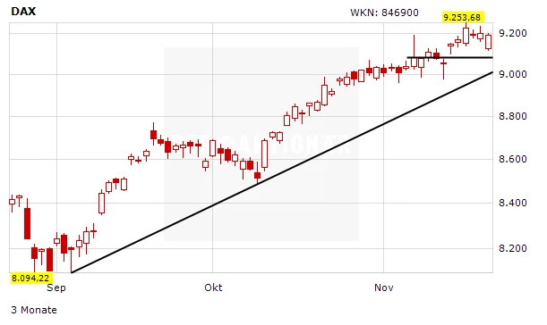 Aus charttechnischer Sicht ist beim DAX alles im Lot. Der kurzfristige, seit Anfang September gültige Aufwärtstrend ist intakt. Die Trendlinie verläuft momentan knapp oberhalb der 9.000-Punkte-Marke. Für ein neues Kaufsignal ist freilich der Sprung über das bisherige Allzeithoch bei 9.254 Zählern vonnöten. Sollte dies erfolgen, hätte der DAX Luft bis in den Bereich von 9.400 Punkten.
