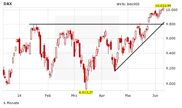 Auch wenn kurzfristig das Ringen um die vor allem psychologisch wichtige Marke weitergehen dürfte, stehen die mittelfristigen Vorzeichen weiterhin auf grün. Insbesondere nach der jüngsten EZB-Entscheidung fehlen den Anlegern klar die Alternativen zu Investments in Aktien. Von charttechnischer Seite erhält der DAX Unterstützung vom kurzfristigen Aufwärtstrend sowie durch den horizontalen Support bei 9.810 Punkten. Die nächste Zielmarke liegt bei 10.400 Punkten. Anleger lassen ihre Gewinne im empfohlenen Mini-Long mit der WKN DZP 8FV (akt. Kurs: 13,27 Euro) weiter laufen, sichern ihre Position aber mit einem Stopp bei 9.740 Punkten nach unten ab.