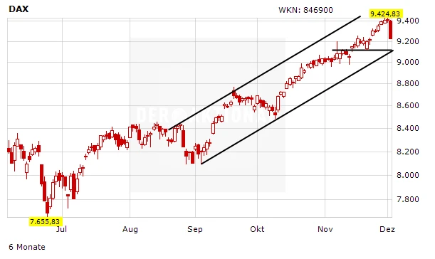 Auch wenn der DAX am Dienstag einen heftigen Einbruch von fast zwei Prozent zu verkraften hatte, ist das charttechnische Bild weiterhin bestens. Kurzfristig könnte die Korrektur zwar noch etwas weitergehen, weswegen Anleger die derzeitige Situation vorerst von der Seitenlinie aus beobachten sollten. Gelingt aber der erfolgreiche Test des seit September ausgebildeten Aufwärtstrends, können Investoren wieder über einen Einstieg nachdenken. Langfristig sind die Aussichten ohnehin bestens. Das sieht auch die Deutsche Bank so: Sie hat das Kursziel für den DAX für 2014 von 9.700 Punkten auf 11.000 Punkte angehoben.