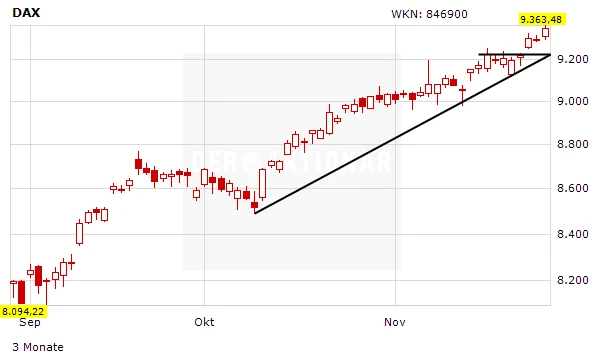 Positive Konjunkturdaten aus den USA haben den deutschen Aktienmarkt am Nachmittag auf ein neues Allzeithoch getrieben. Kurz vor 16:00 Uhr kletterte der DAX auf 9.363,48 Punkte und damit den höchsten Stand in seiner 25-jährigen Geschichte. Das Wirtschaftsvertrauen in den USA hat sich im November überraschend aufgehellt und auch die Frühindikatoren stiegen entgegen den Erwartungen.