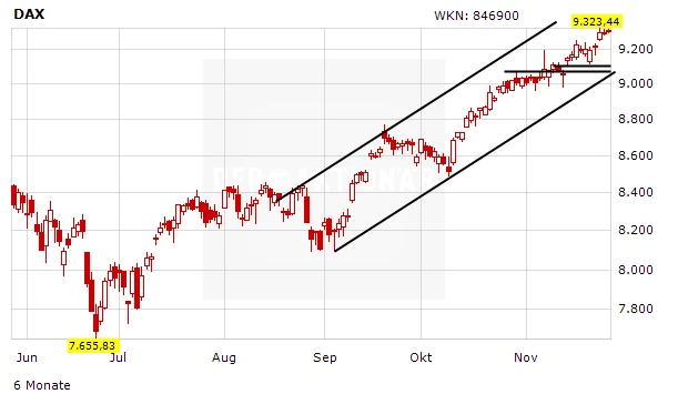 Unterstützt von der Einigung in den Koalitionsverhandlungen sind die deutschen Standardwerte am Mittwoch freundlich in den Handel gestartet. Bis zum späten Vormittag legte der DAX um 0,25 Prozent auf 9.313,07 Punkte zu und befindet sich damit nur noch knapp unter seinem Rekordhoch vom Montag bei 9.323,44 Zählern. Profitiert hat der deutsche Leitindex unter anderem von einem starken GfK-Konsumklima.