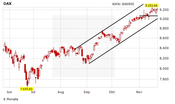 Die Rekordjagd an den New Yorker Börsen vor dem Wochenende dürfte auch die deutschen Aktien zum Auftakt am Montag in Richtung neuer Hochs treiben. Der Broker IG taxiert den DAX vor dem Handelsstart 0,4 Prozent höher bei 9.251 Punkten. Damit wird der Leitindex nur marginal unter seinem jüngsten Rekordhoch bei 9.254 Punkten errechnet. IG verweist auf die guten Vorgaben der Wall Street als entscheidenden Antrieb.