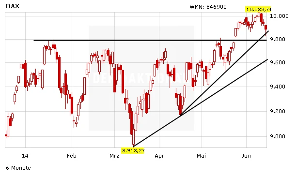 Aus charttechnischer Sicht gibt es allerdings noch keinen Grund zur Sorge. Der seit Mitte April ausgebildete Aufwärtstrend ist nach wie vor intakt, genauso wie die horizontale Unterstützung bei 9.810 Punkten. Knapp darunter verläuft außerdem der Aufwärtstrend seit März. Diese Unterstützungen gilt es nun zu verteidigen. Ein Rutsch darunter würde weiteres Abwärtspotenzial bis mindestens in den Bereich von 9.500 Punkten bedeuten. Halten die Supportmarken hingegen, dürfte nach einer Krafttankphase relativ bald ein weiterer Angriff in Richtung 10.000 Punkte erfolgen. Anleger lassen ihre Gewinne im Mini-Long mit der WKN DZP 8FV laufen, ziehen zur Absicherung den Stopp aber in den Bereich von 9.770 Punkten oder 10,75 Euro nach.