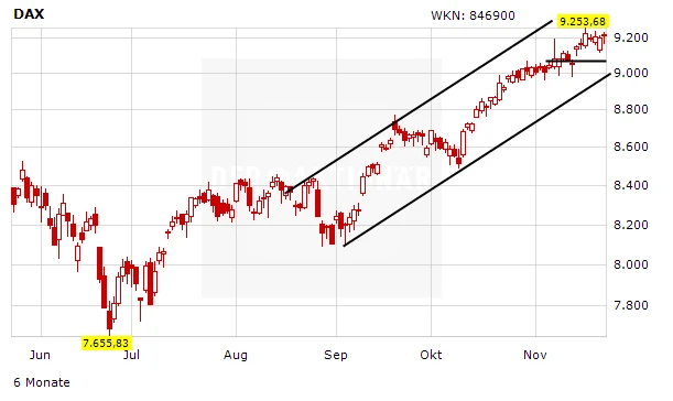 Nachdem der DAX seine anfänglichen Gewinne zunächst abgeben musste, konnte sich der deutsche Leitindex am Nachmittag wieder in die Gewinnzone zurückretten. Gegen 14.30 Uhr notiert der DAX bei 9.218 Zählern und damit 0,2 Prozent im Plus. Etwas unter die Arme gegriffen haben dürfte ihm dabei das überraschend starke Ifo-Geschläftsklima. Dieses kletterte von 107,4 Punkten im Vormonat auf 109,3 Zähler im November. Volkswirte hatten lediglich einen leichten Anstieg auf 107,7 Punkte erwartet.