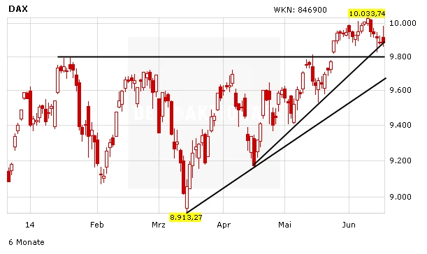 An der charttechnischen Situation hat sich demnach nichts geändert. Der nachhaltige Sprung über die 10.000-Punkte-Marke steht weiterhin aus. Der kurzfristige Aufwärtstrend sowie die Unterstützung bei 9.810 Punkten haben aber weiterhin Bestand. Anleger bleiben im empfohlenen Mini-Long mit der WKN DZP 8FV (akt. Kurs: 11,80 Euro) investiert, sichern sich aber mit einem Stopp im Bereich von 9.770 Punkten oder 10,75 Euro ab.