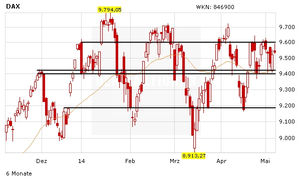 Der DAX bewegt sich damit weiter in der engen Range zwischen 9.400 und 9.600 Punkten seitwärts. Solange dieser Korridor nicht nachhaltig verlassen wird, bietet sich kein Engagement im DAX an. DER AKTIONÄR hat ein Stop-Buy-Limit für einen DAX-Short im Markt platziert.
