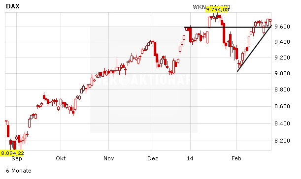 Der DAX hatte am Montag und Dienstag bereits einen Ausbruch aus der Seitwärtsrange zwischen 9.500 und 9.700 Punkten angedeutet, doch jedes Mal erwies sich der Sprung über die obere Begrenzungslinie als Bullenfalle. Wer den empfohlenen Turbo-Optionsschein mit der WKN DZP 3M4 im Depot hat, sollte aber investiert bleiben, Neueinsteiger warten den Ausbruch ab.