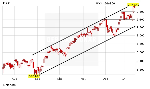 Noch ist die Marke von 10.000 Punkten 2,7 Prozent entfernt. Um diese zum Wochenschluss knacken zu können, müssten schon äußerst positive Nachrichten aus den USA kommen. Wahrscheinlicher ist, dass der DAX den Angriff auf die magische Marke noch einmal vertagt. Anleger bleiben aber in jedem Fall weiter im vom AKTIONÄR empfohlenen DAX-Turbo-Long mit der WKN DZP 86G investiert. Dieser notiert bereits mehr als 25 Prozent im Plus. Der Stopp sollte zur Absicherung weiter im Einstandsbereich bei 7,25 Euro platziert werden.