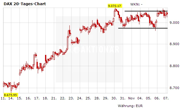 Gegen 10:30 Uhr notiert der DAX bei 9.035 Punkten - ein Minus von gerade einmal fünf Punkten gegenüber dem Vortagesschluss. Wie erwartet hält sich der deutsche Leitindex in seiner Range zwischen 8.980 und 9.053 Zählern. Positive Impulse kommen von der Commerzbank und Siemens, deren Zahlen Freudenstürme bei den Anlegern ausgelöst haben. Im Gegensatz dazu verlieren HeidelbergCement und Munich Re überproportional.