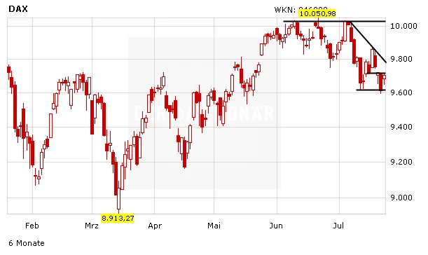 Damit hat der DAX nach drei Verlusttagen in Folge klar den Erholungskurs eingeschlagen. Der erste Schock über die Eskalation der Konflikte in der Ukraine und dem Gazastreifen scheinen überwunden, sagte Analyst Andreas Paciorek von CMC Markets. Am heutigen Dienstag läuft der Index nun auf die Tageshöchstkurse vom Freitag vergangener Woche im Bereich von 9.720 Punkten zu. Gelingt der nachhaltige Sprung darüber, wäre dies als klares positives Zeichen zu werten und risikobereite Anleger könnten sich wieder auf der Longseite positionieren. Sollte er hingegen an dieser Hürde scheitern, sind Investoren gut beraten, sich mit einem Abstauberlimit bei 9.439 Punkten oder 8,10 Euro beim Turbo-Bull mit der WKN DZP 38G zu positionieren und einen engen Stopp bei 9.340 Zählern oder 7,10 Euro zu setzen.