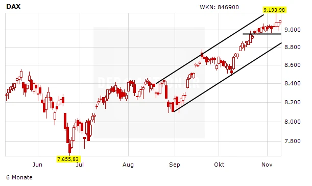 Das bullishe Umfeld für den DAX ist weiterhin intakt, neue Höchstkurse in diesem Jahr noch möglich. Der empfohlene Turbo-Long der DZ Bank mit der WKN DZJ 8YE (Kaufkurs: 10,06 Euro) hat entsprechend noch Potenzial. Zur Gewinnabsicherung sollte ein Stopp bei 8.975 Punkten oder umgerechnet 12,40 Euro platziert werden.