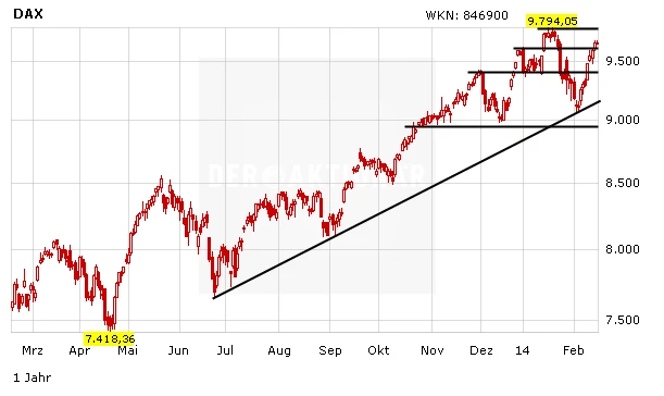 Anleger, die bereits beim Turbo-Optionsschein mit der WKN DZP 3M4 investiert sind, sollten an ihrer Position festhalten. Kurzfristig könnte der DAX das bisherige Rekordhoch anlaufen. Danach dürfte einmal die Marke von 10.000 Punkten ins Visier rücken. Der Stopp zur Absicherung sollte vorerst bei 10,10 Euro belassen werden.