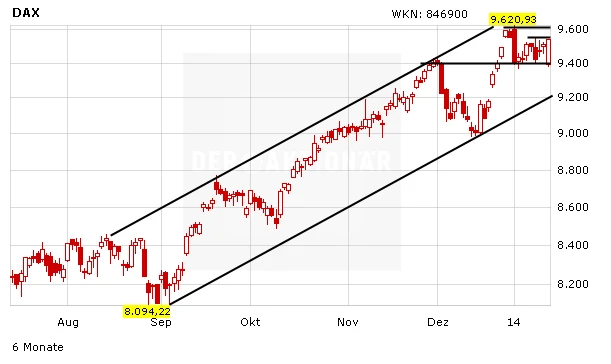 Aus charttechnischer Sicht stehen die Ampeln beim DAX wieder auf grün. Am Dienstag gelang es dem Index die Marke von 9.542 Punkten zu überwinden. Damit ist nun Luft bis in den Bereich des Allzeithochs bei 9.621 Zählern – die letzte Hürde auf dem Weg in Richtung 10.000 Punkte. Das Limit des AKTIONÄR für den DAX Turbo-Long mit der WKN DZP 86G bei 7,25 Euro ist damit aufgegangen. Der Stopp zur Absicherung sollte nun bei 9.460 Punkten oder 6,40 Euro platziert werden.