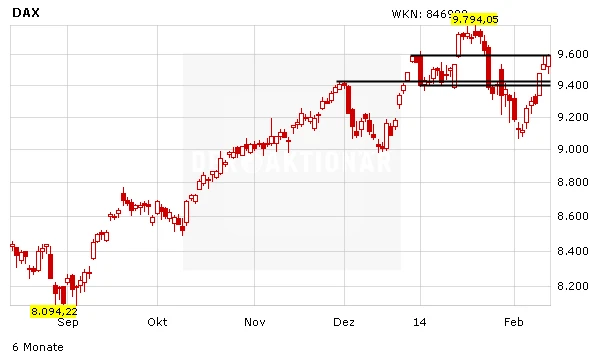 Im späten Donnerstagshandel war der Leitindex bereits auf 9.640 Punkte geklettert und damit über die charttechnisch wichtige Marke von 9.600 Punkten. Schafft der Index diesen bedeutenden Widerstand zu überwinden, könnte es erneut zu einem Test des bisherigen Rekordhochs bei 9.794 Punkten kommen.