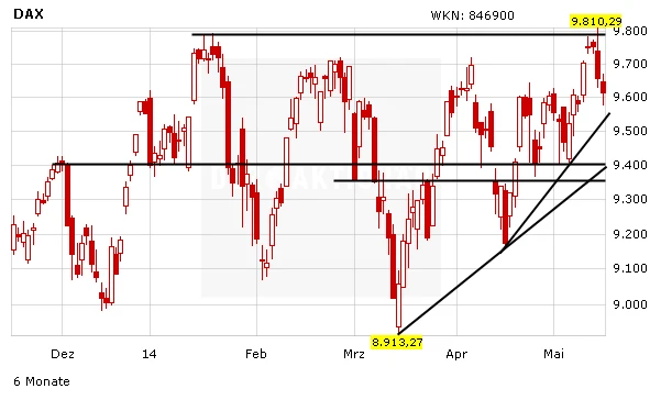 Doch wirklichen Grund zur Sorge gibt es nicht. Der kurzfristige seit Mitte April ausgebildete Aufwärtstrend ist nach wie vor intakt. Noch größere Bedeutung muss dem März-Aufwärtstrend beigemessen werden, in dessen Bereich eine immens wichtige Unterstützungszone verläuft. Hier befinden sich bei 9.400 Punkten und bei 9.367 Zählern starke Supportmarken. Ob dieser Bereich aber tatsächlich noch einmal erreicht wird, ist fraglich.