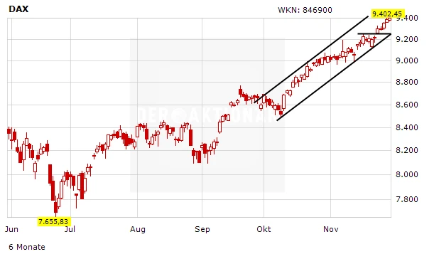 Erstmals in seiner Geschichte ist der deutsche Leitindex am Freitag über die Marke von 9.400 Punkten geklettert. Bei 9.414 Zählern markierte er ein vorläufiges neues Allzeithoch. Beflügelt wird der deutsche Aktienmarkt von einem guten Start der US-Börsen. Der Dow Jones legt zum Auftakt am Freitag 0,3 Prozent auf 16.143 Punkte zu. Am Donnerstag hatten die New Yorker Börsen wegen des Thanksgiving-Feiertages in den USA geschlossen. Da sich viele Marktteilnehmer aufgrund des Feiertags im Kurzurlaub befinden, wird der ruhig und impulsarm erwartete Handel nur bis 19 Uhr statt wie üblich bis 22 Uhr MEZ laufen.