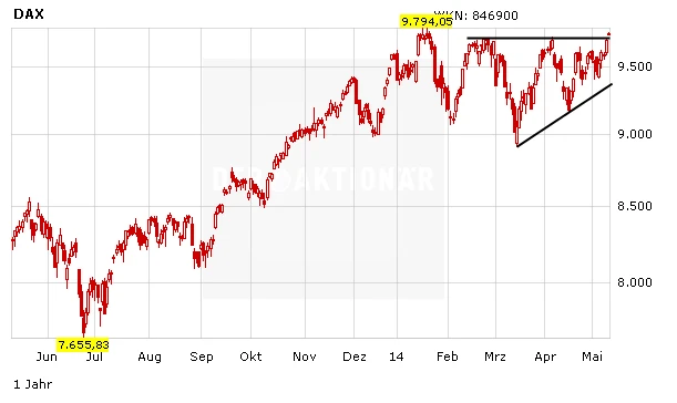 Nach dem erfolgreichen Ausbruch über die jüngsten drei Hochpunkte von Ende April und Anfang Mai befindet sich DER AKTIONÄR mit dem Mini-Long mit der WKN DZP 8FV (Kaufkurs: 9,99 Euro; akt. Kurs: 11,07; Hebel: 9,0) aus dem Hause der DZ Bank wieder auf der Long-Seite. Anleger bleiben mit einem relativ engen Stopp im Bereich von 9.550 Punkten oder 8,79 Euro weiter investiert und spekulieren damit auf den großen Ausbruch.
