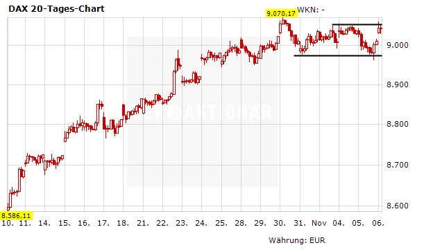 In den letzten Handelstagen ist der DAX in eine Seitwärtsrange um die 9.000-Punkte-Marke herum übergegangen. Die Range reicht von 8.980 Punkten auf der Unter- bis 9.053 Zähler auf der Oberseite. Solange dieser Bereich nicht verlassen wird, können sich Trader noch zurücklehnen.