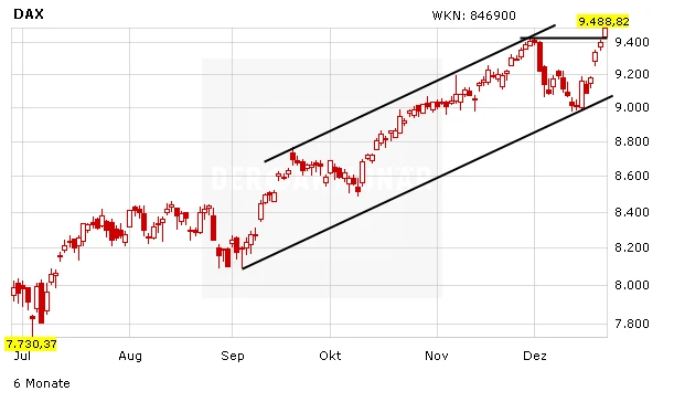 Der DAX hat am ersten Handelstag nach Weihnachten abermals ein Rekordhoch erklommen. Am Freitag markierte der deutsche Leitindex bei 9.562,67 Punkten kurz nach dem Start eine neue Bestmarke. Zuletzt stand er noch 0,72 Prozent höher bei 9.557,10 Punkten. Während die Börsen hierzulande in der Weihnachtspause waren, hatten in den USA robuste Konjunkturdaten für gute Stimmung gesorgt. Dort waren der Auftragseingang für langlebige Güter im November sowie die Erstanträge auf Arbeitslosenhilfe in der vergangenen Woche überraschend positiv ausgefallen.